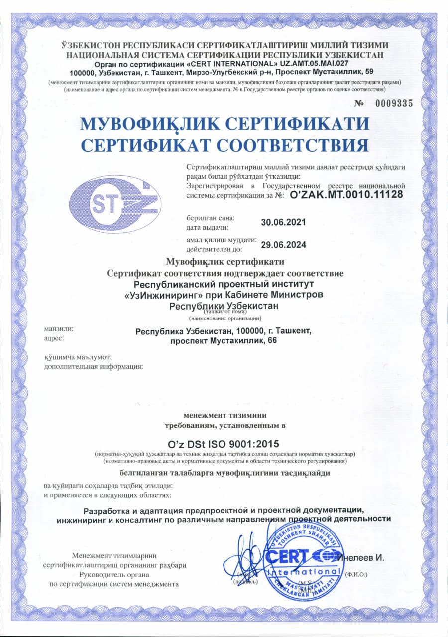 Certificate of Conformity of the National Certification System of the Republic of Uzbekistan.